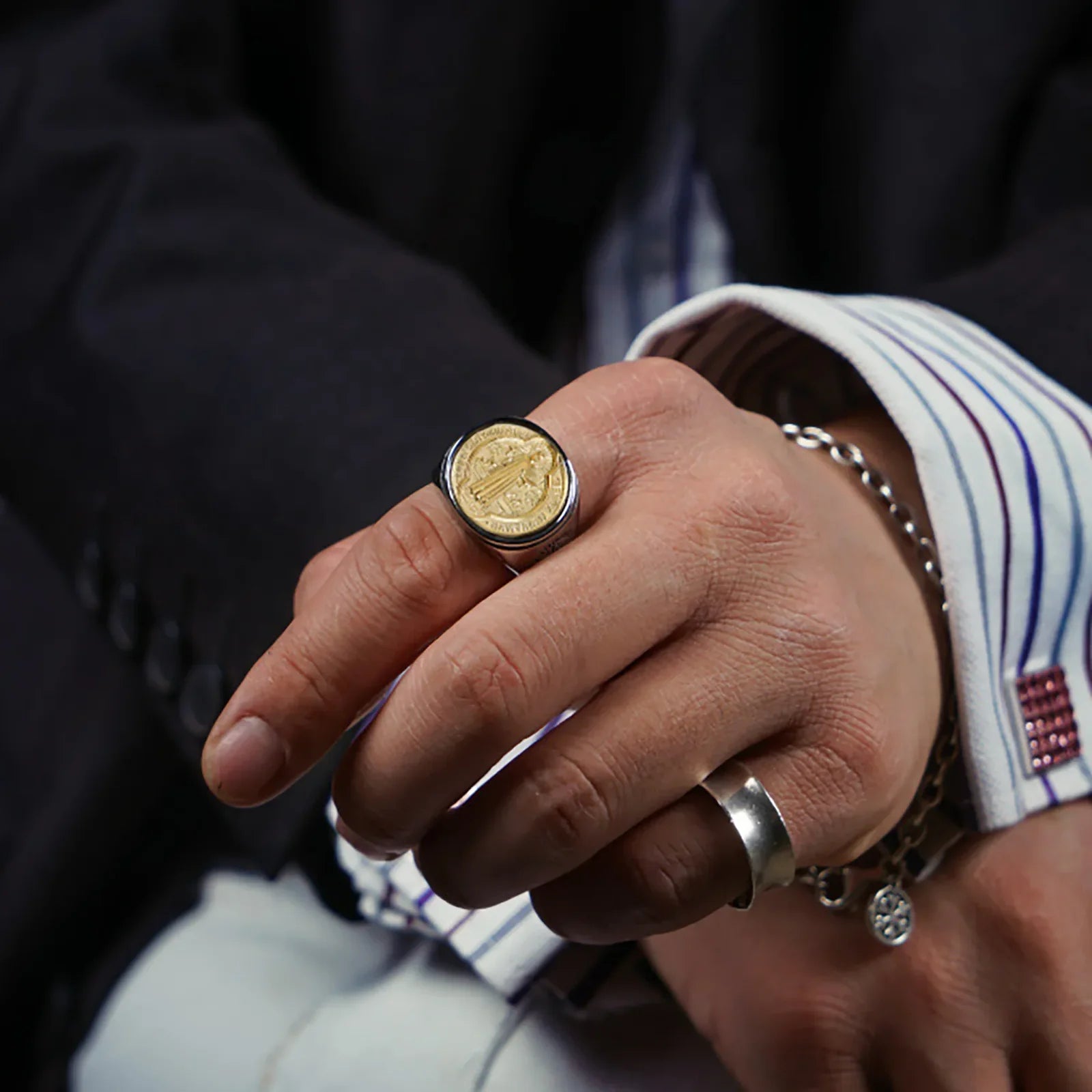 This ring features the Saint Benedict medallion, one of the most respected symbols in Christian tradition. The medallion is known for its association with faith, perseverance, and spiritual protection, making it a meaningful piece for everyday wear.
