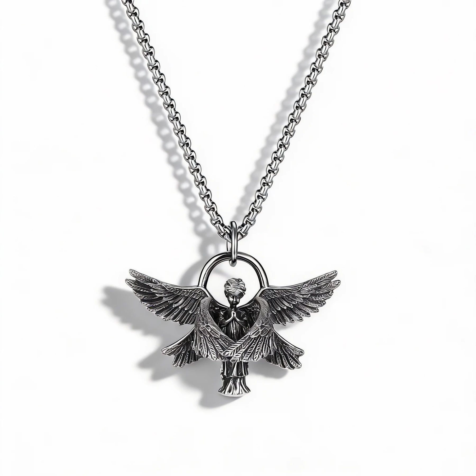 Crafted from alloy and finished with electroplating, the pendant and chain offer a solid feel and lasting shine. The textured details highlight the wings and robe, giving the piece a strong visual presence.
