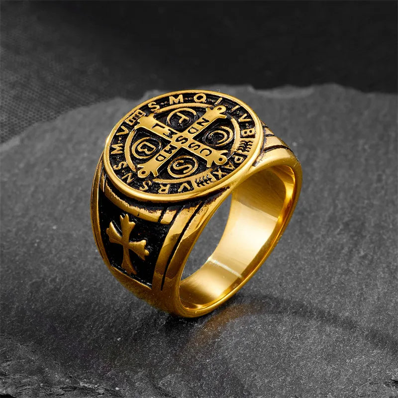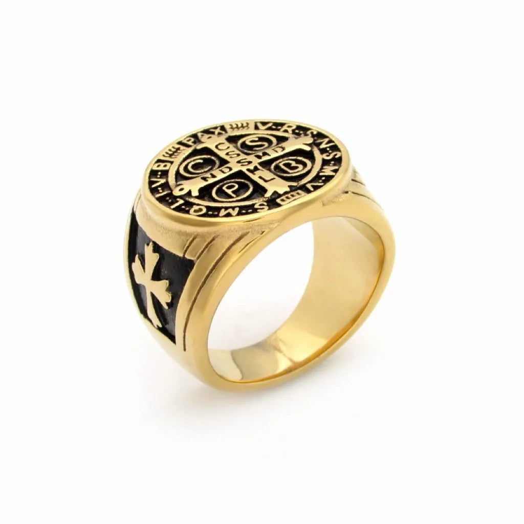 This ring features the Saint Benedict medal, one of the most respected and time honored symbols in Christian tradition. Known for its deep spiritual meaning, the medal has long been associated with faith, perseverance, and inner strength.