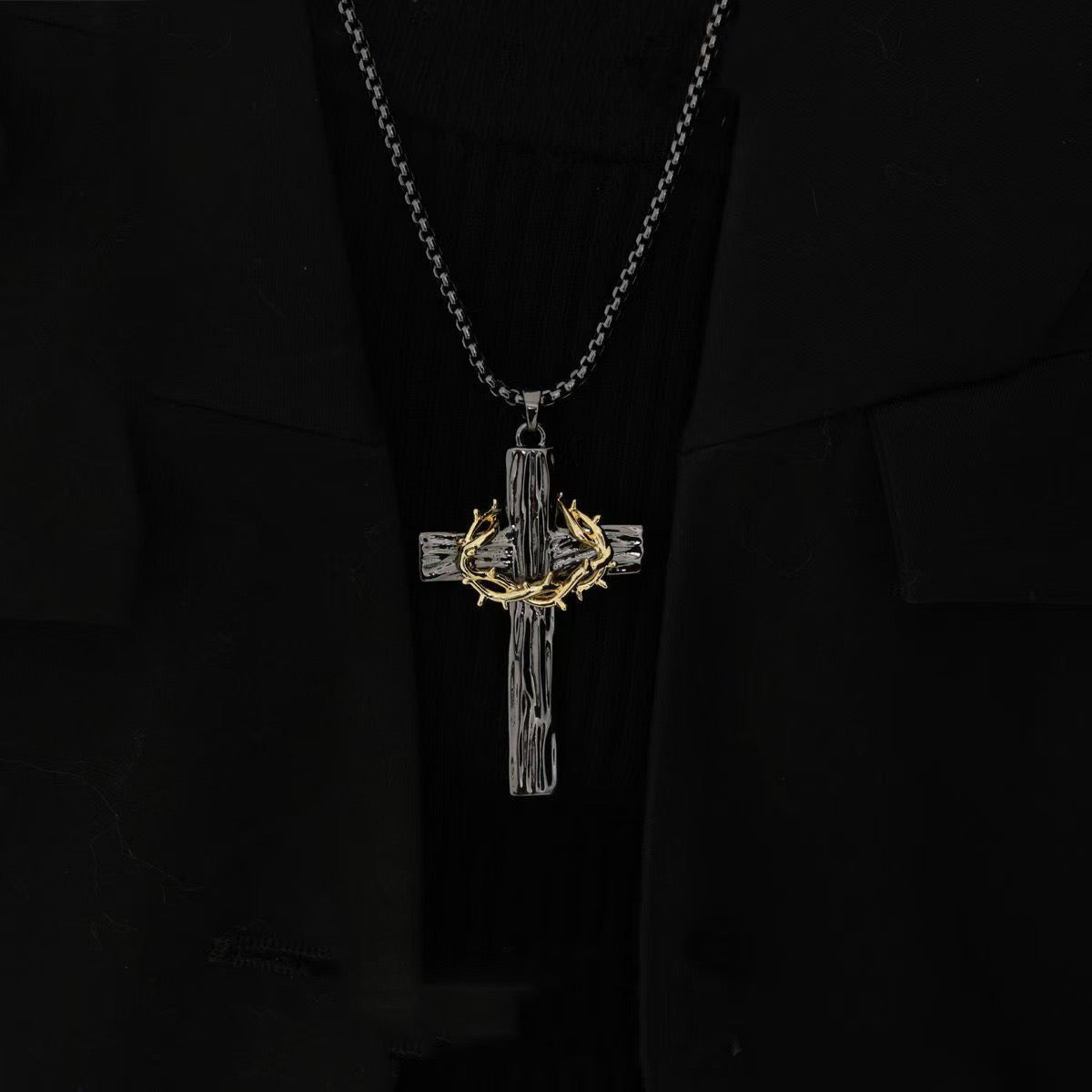 The BlessingTree Stainless Steel Cross Necklace brings together sacred Christian symbolism and a bold modern aesthetic. The cross features a distinctive woodgrain texture, symbolizing the Cross itself, while the golden Crown of Thorns represents sacrifice, redemption, and unwavering faith.