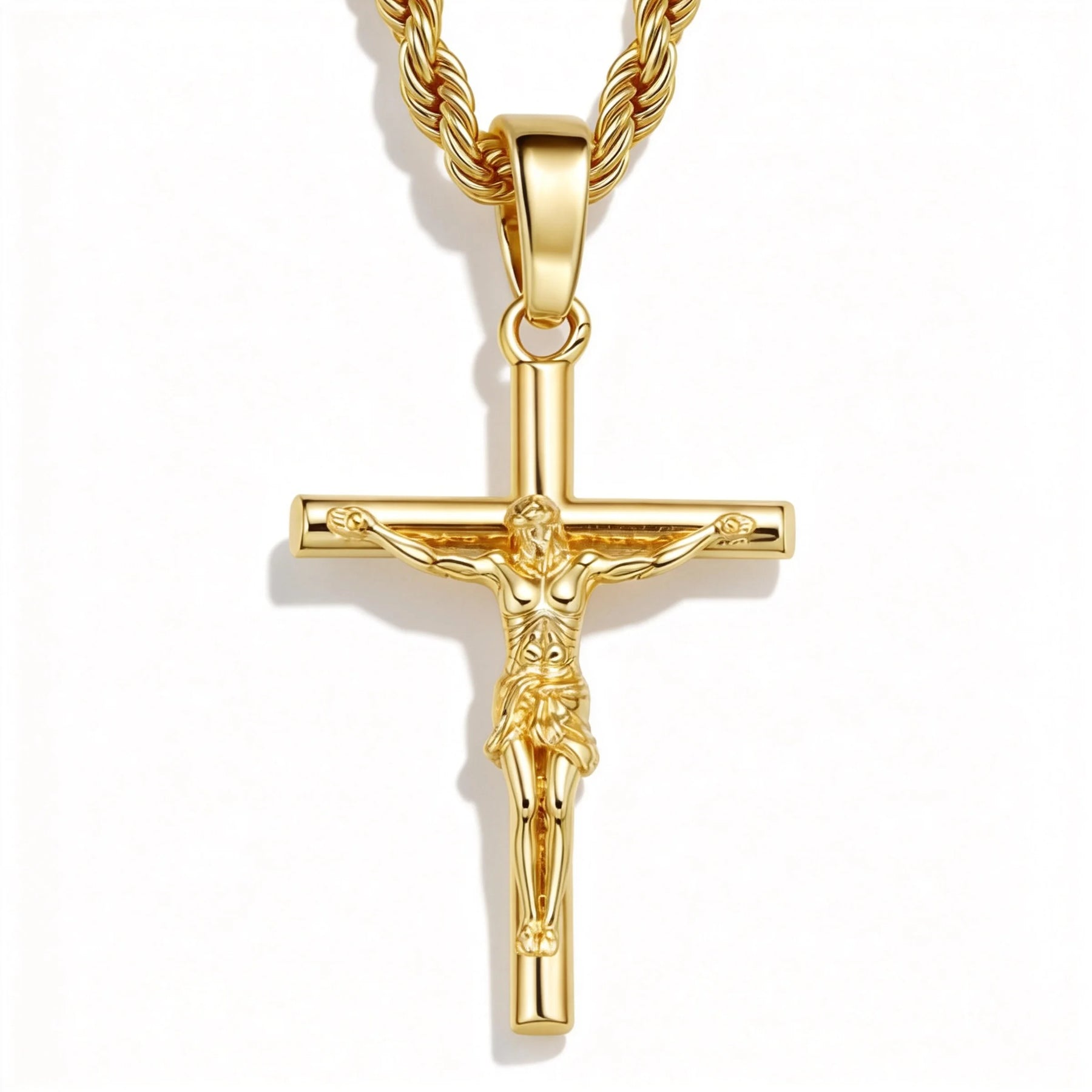 This BlessingTree crucifix necklace features a traditional Latin cross adorned with a detailed figure of Jesus Christ. The warm 18K gold plating gives the entire piece a radiant, eye-catching glow that reflects light beautifully. With its clean lines and balanced proportions, the pendant captures the timeless solemnity of the crucifix while maintaining an elegant, wearable profile suitable for daily devotion or special occasions.