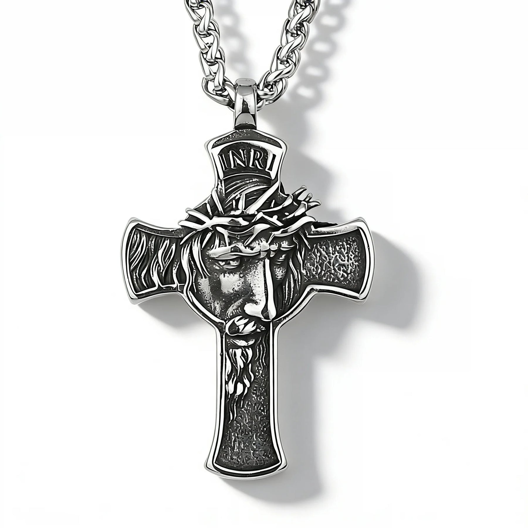This necklace features a cross pendant with a detailed Jesus profile and the INRI inscription at the top. The design presents a strong and timeless form, making it a meaningful piece suitable for everyday wear or personal expression.