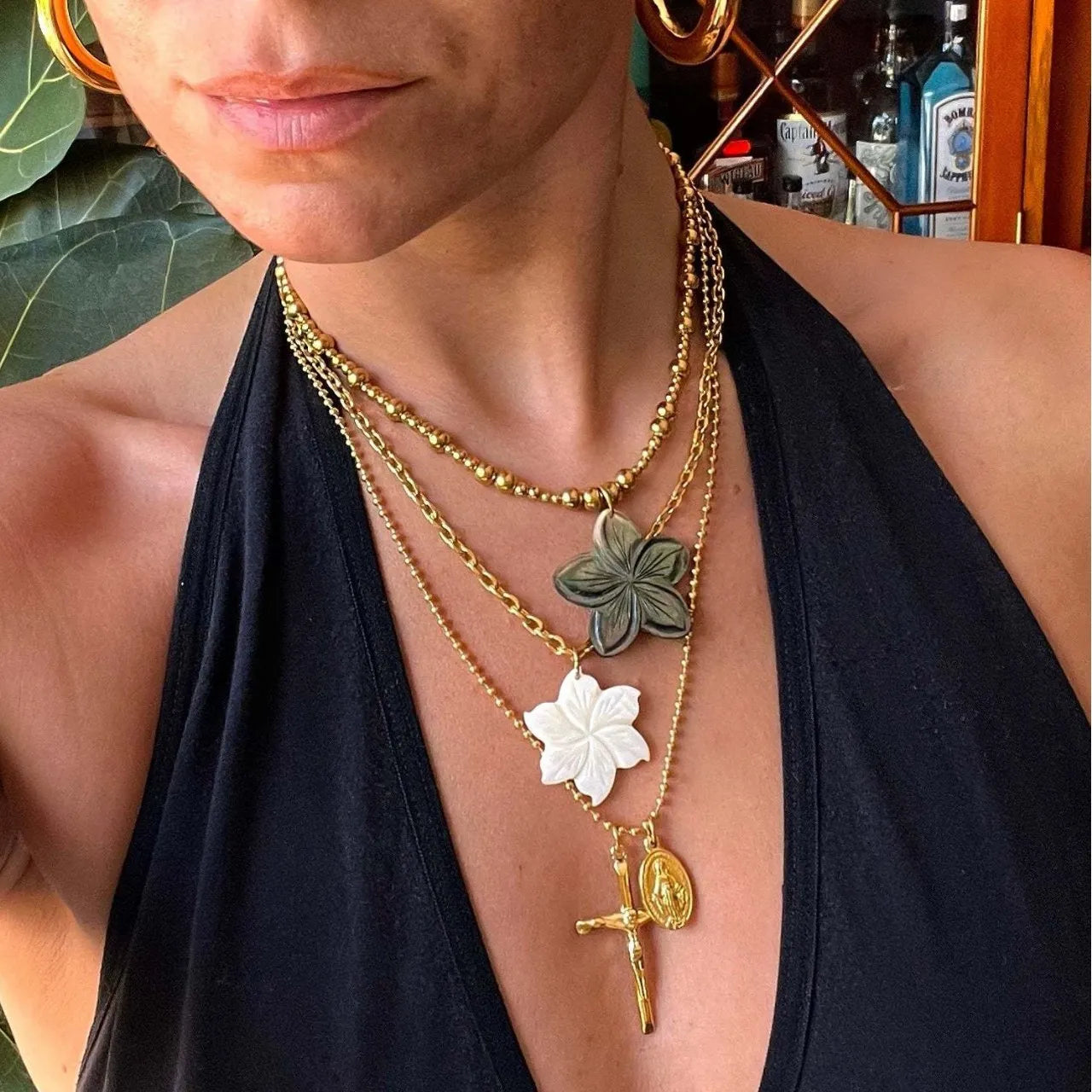 This necklace features a refined cross pendant paired with a Virgin Mary medallion, creating a graceful and meaningful design. The combination brings together classic religious symbolism with a soft, elegant aesthetic suitable for everyday wear.