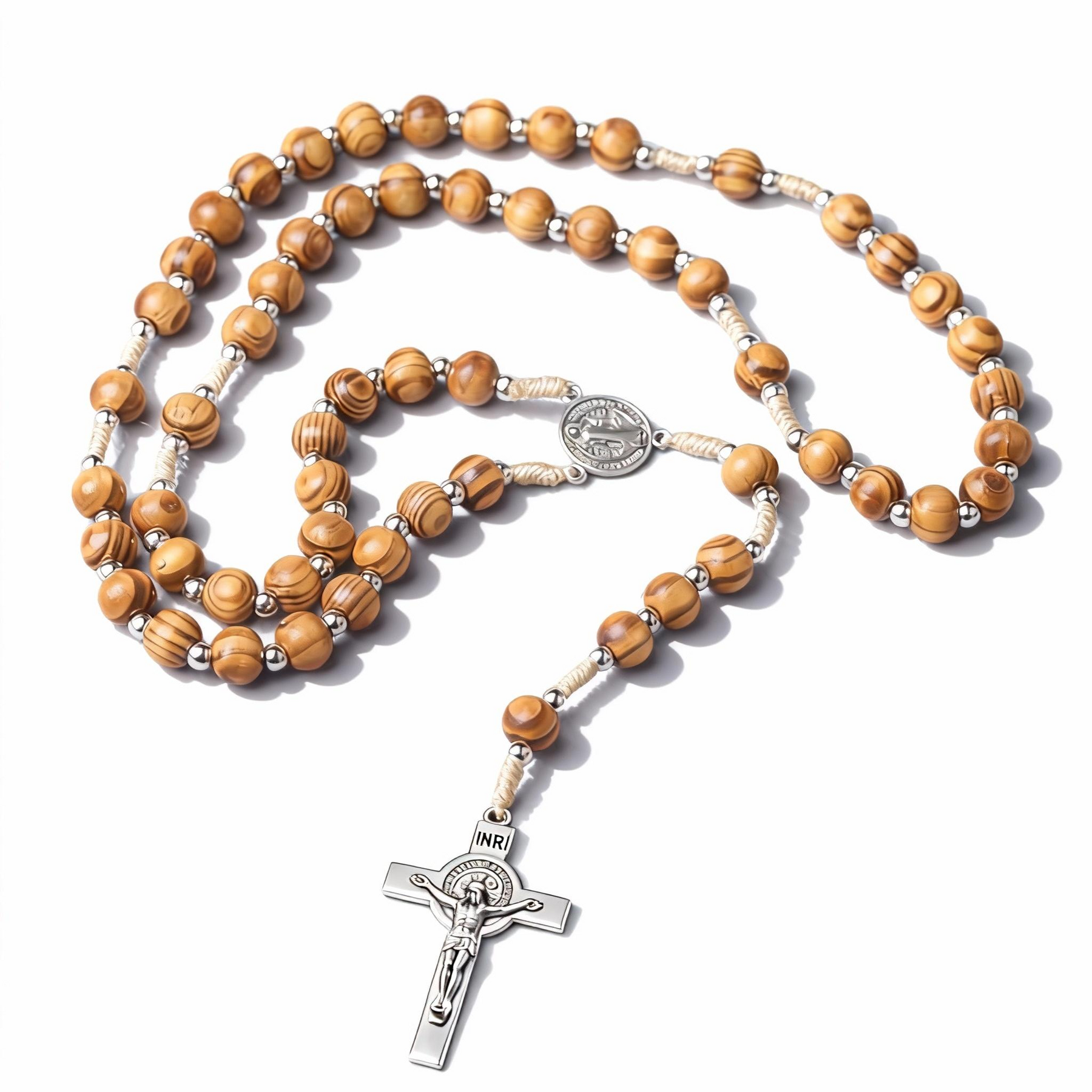 | Material | Natural Wood Beads, Alloy Crucifix, Alloy Center Medal, Braided Cord |