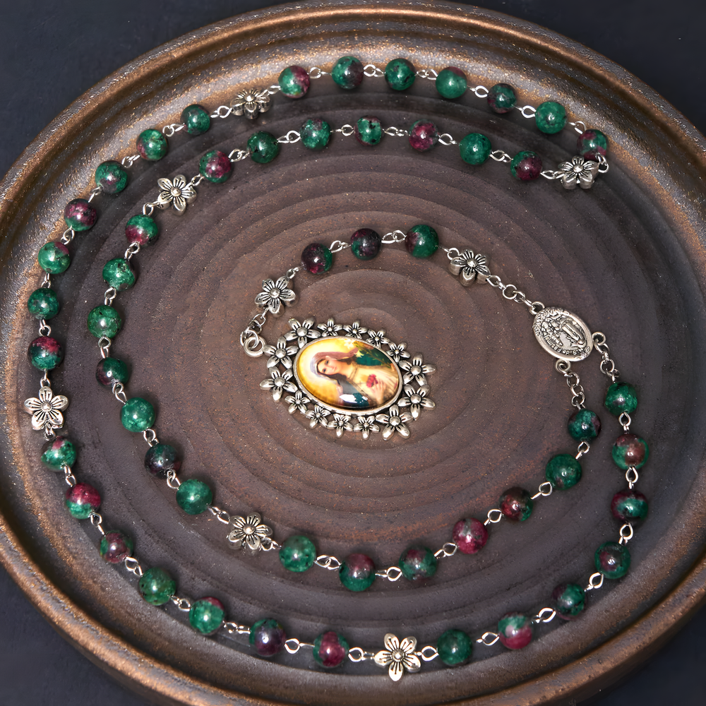 BlessingTree Glass Sacred Heart Rosary Necklace with Natural Stone Beads