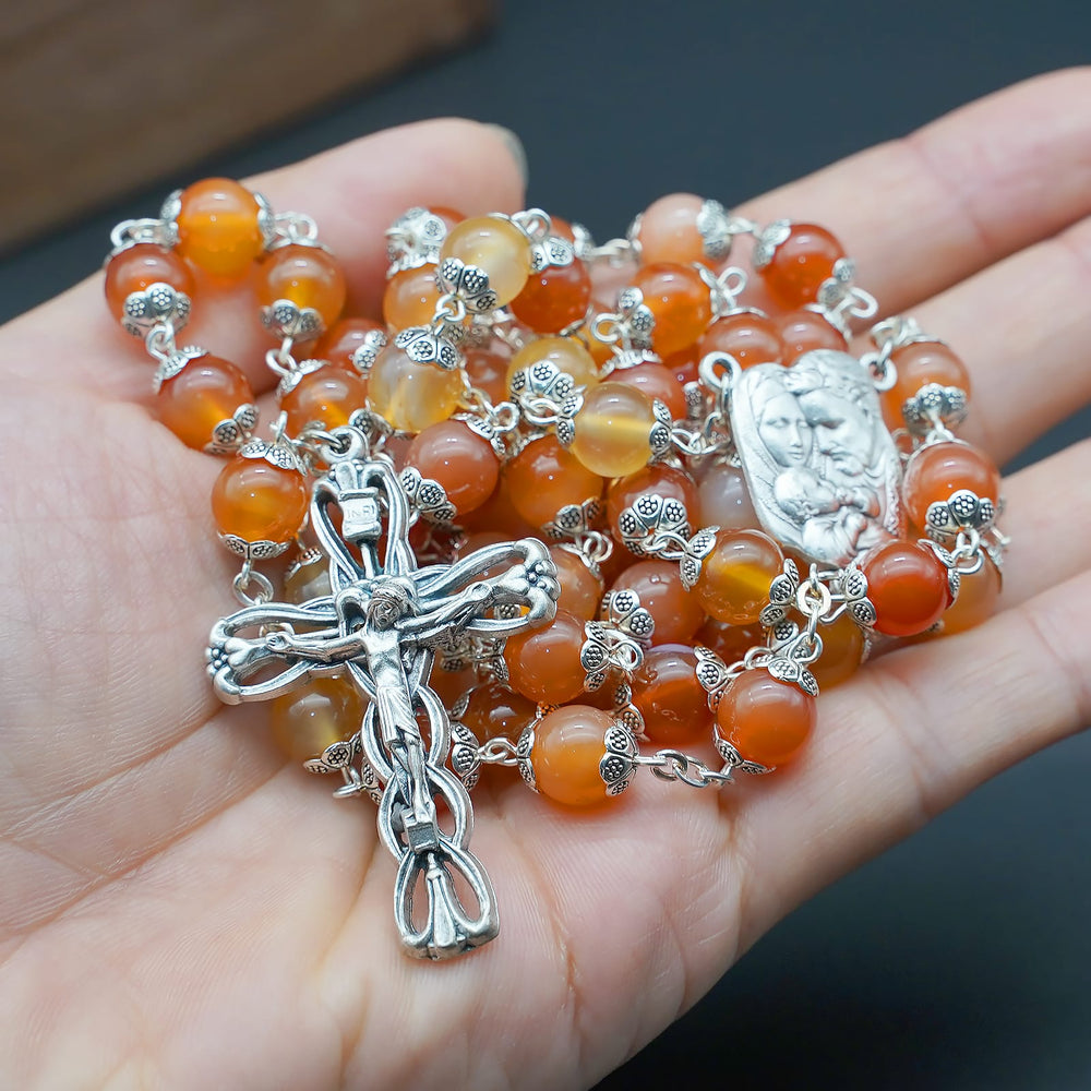 BlessingTree Natural Agate Rosary Bracelet, 8 mm Beads with Floral Caps, Madonna and Child Centerpiece, Vintage Catholic Prayer Jewelry