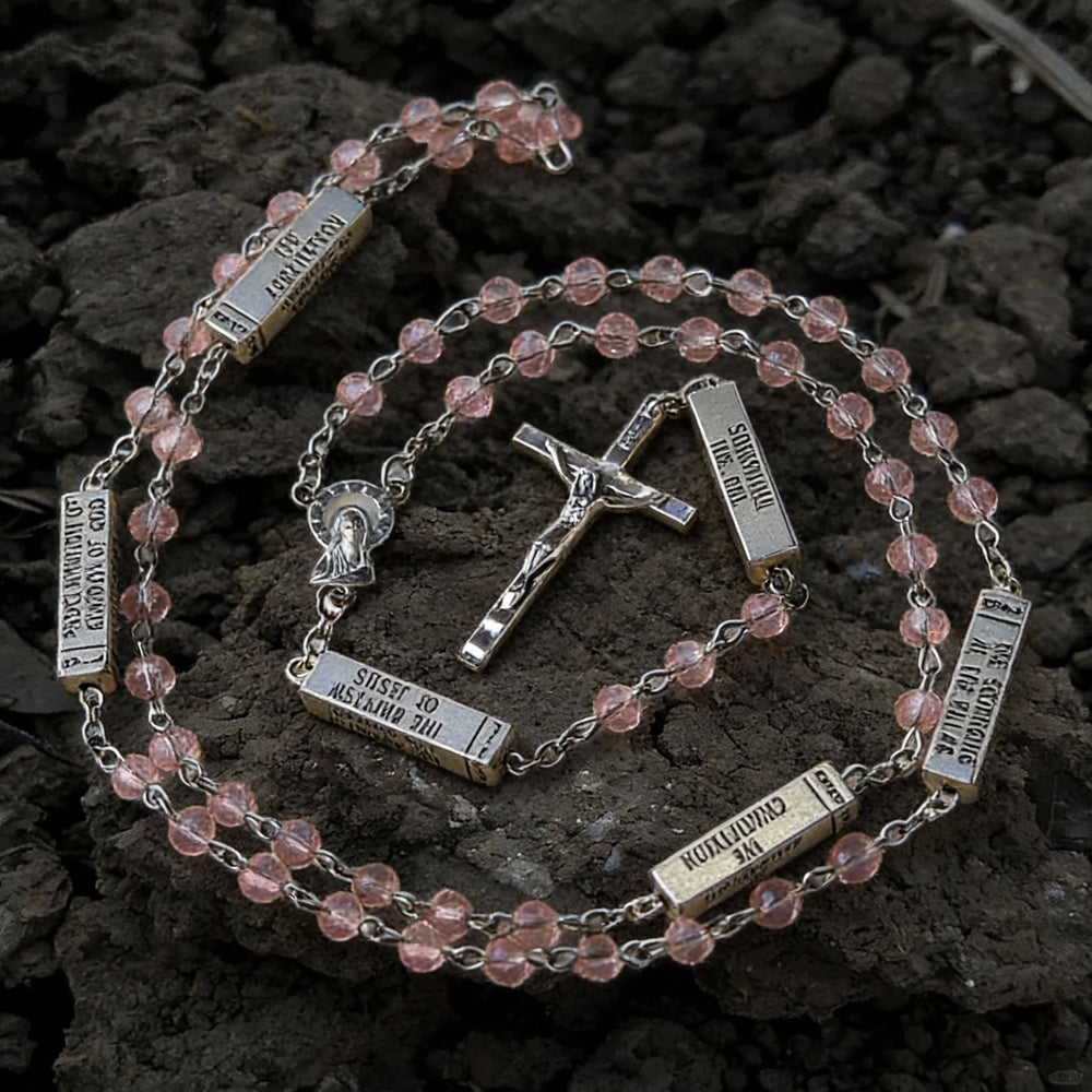 BlessingTree Light Rose Mysteries Rosary Necklace with Silver Crucifix