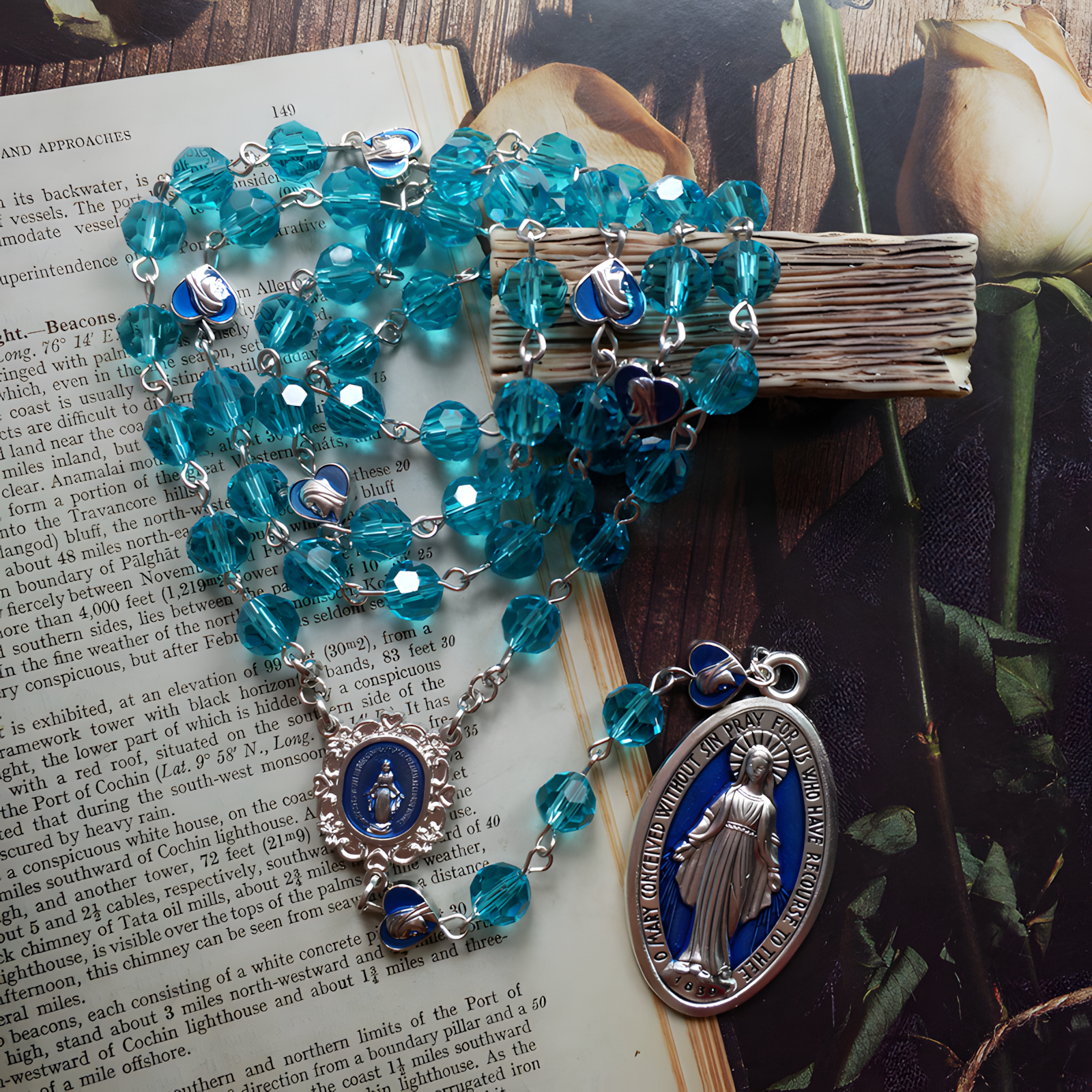 This BlessingTree Miraculous Medal Rosary Necklace radiates serenity and divine beauty. Each faceted glass crystal bead in soft lake blue captures the calmness of faith and the depth of devotion. Its translucent hue mirrors the stillness of holy water—pure, tranquil, and timeless.