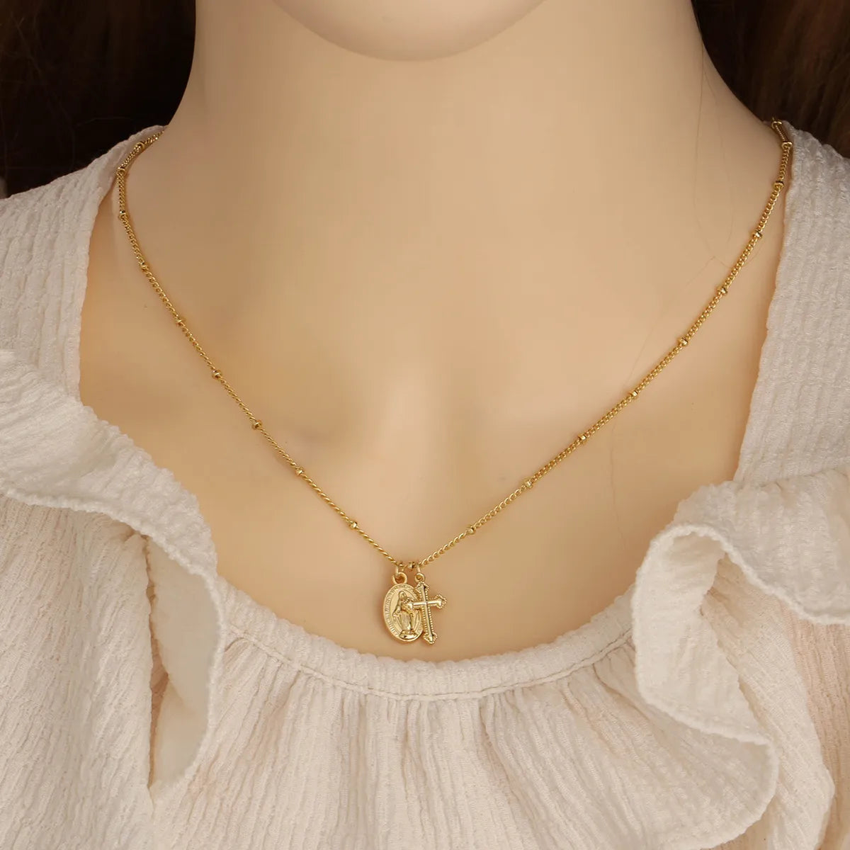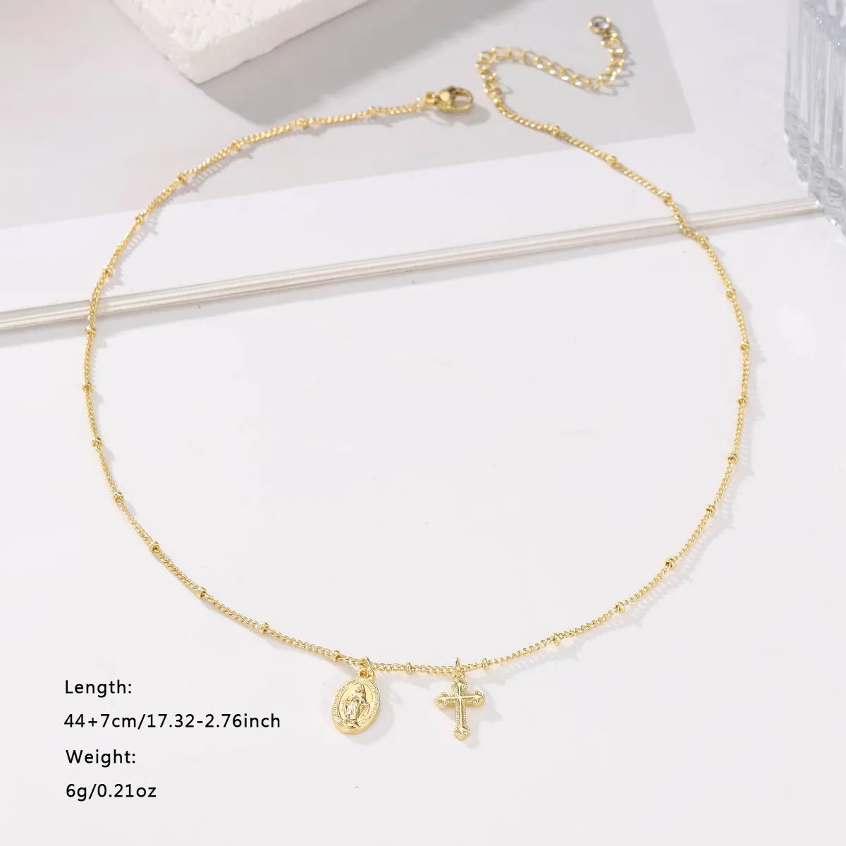 This necklace features a delicate Virgin Mary medallion paired with a classic cross pendant. The combination symbolizes faith, protection, and devotion, making it a meaningful piece for everyday wear.